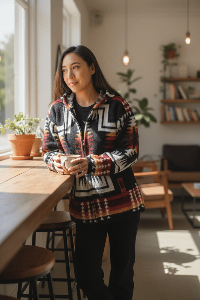 Stunning Quichua sweater made in Ecuador by indigenous families from Quichua communities. The designs and colours represent the combinations of many elements found in nature.