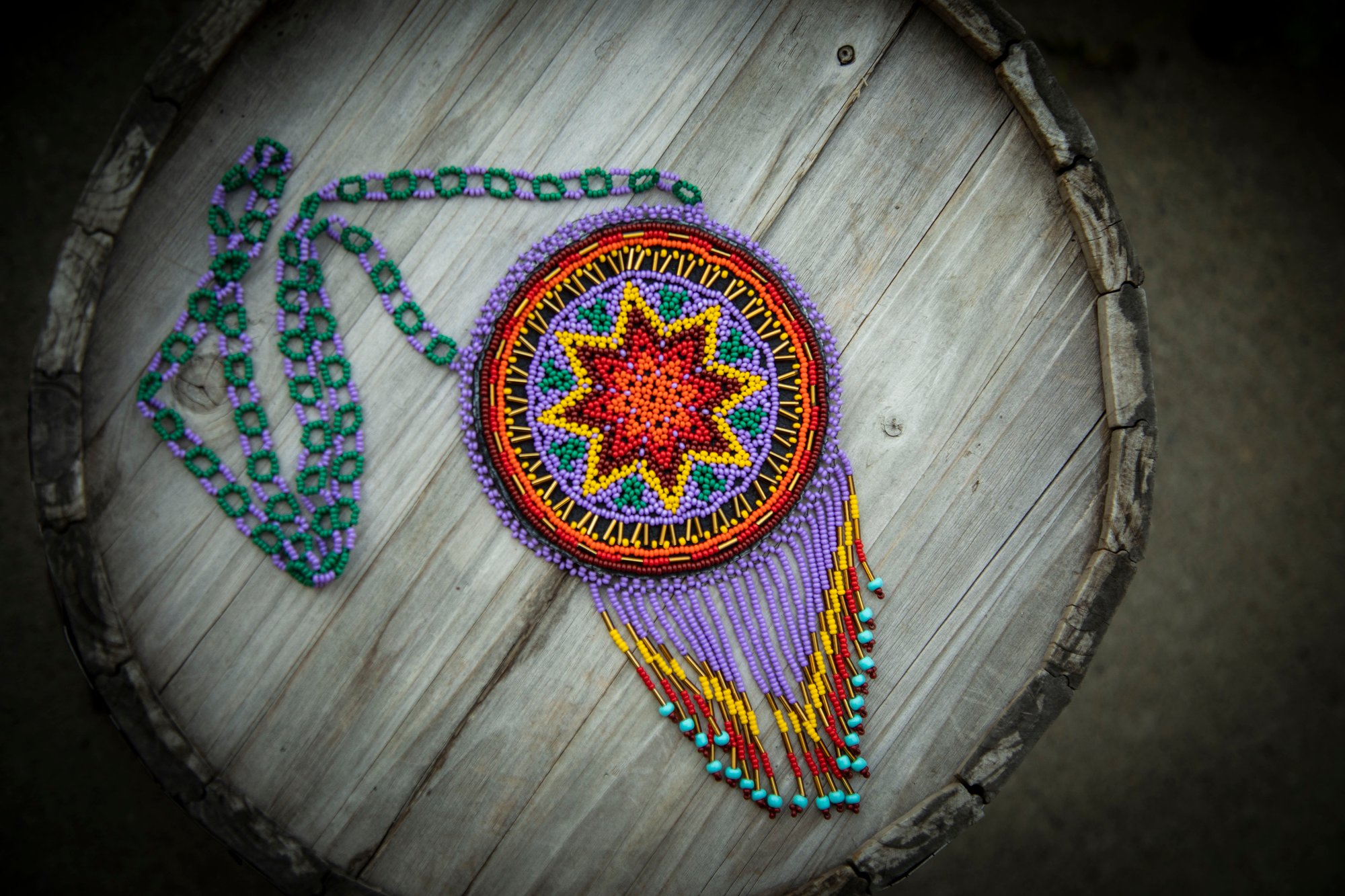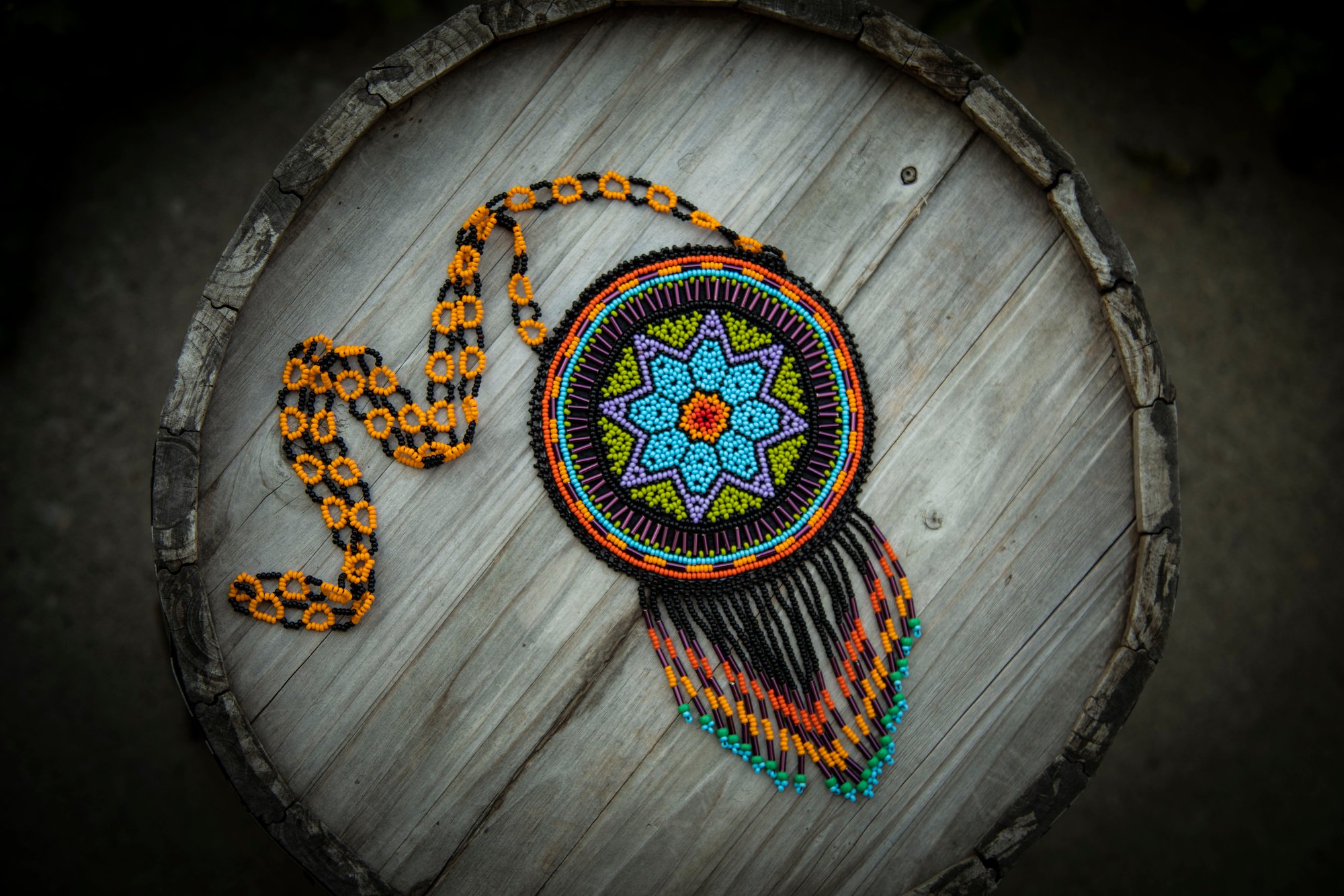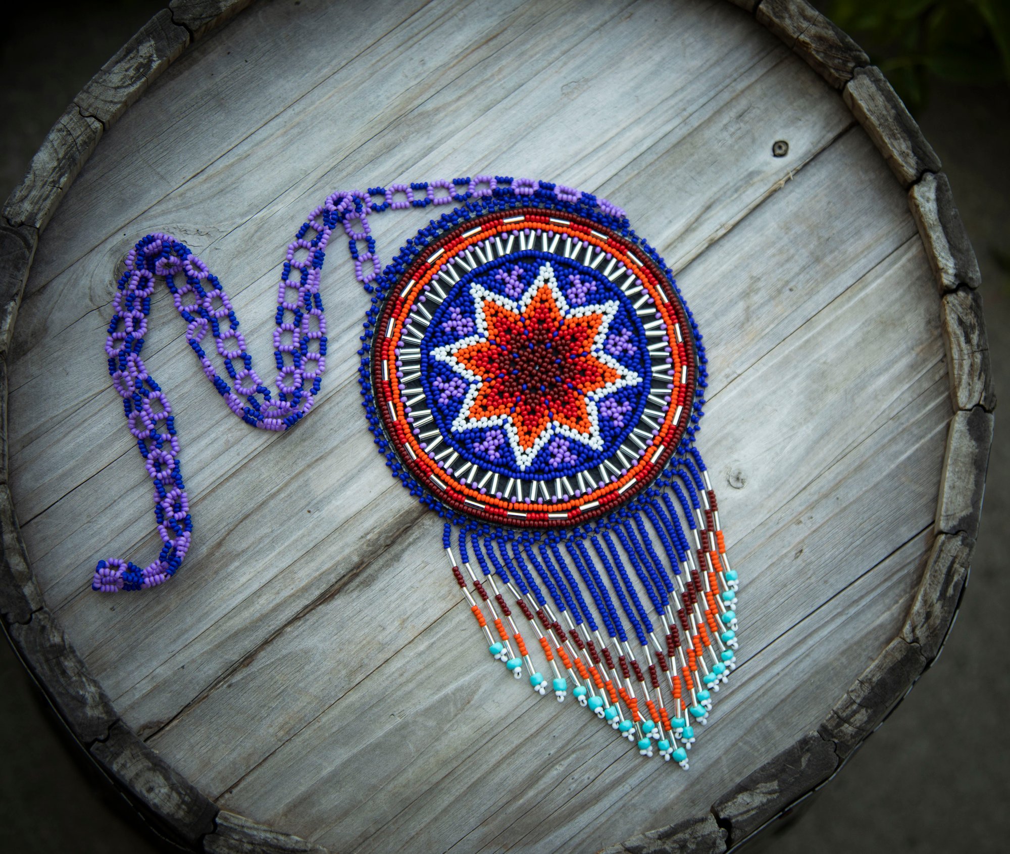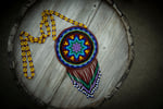 This is a beautiful and unique beaded necklace with a pouch to hold medicine, tobacco, or coins. The pouch is made of leather and is hand-sewn. Each necklace has been blessed in a ceremony and therefore due to the delicate nature of this work. no returns or exchanges are available.