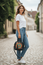 Beautiful handmade backpack created with genuine cow leather. Each bag was individually hand-painted and no design is alike. It includes a zipper on the top to keep your items secure at all times. Fully lined inside with one pocket with a zipper. It also includes long adjustable straps, also made with genuine leather. This backpack allows adding many items and it can be turned into a crossbody bag!